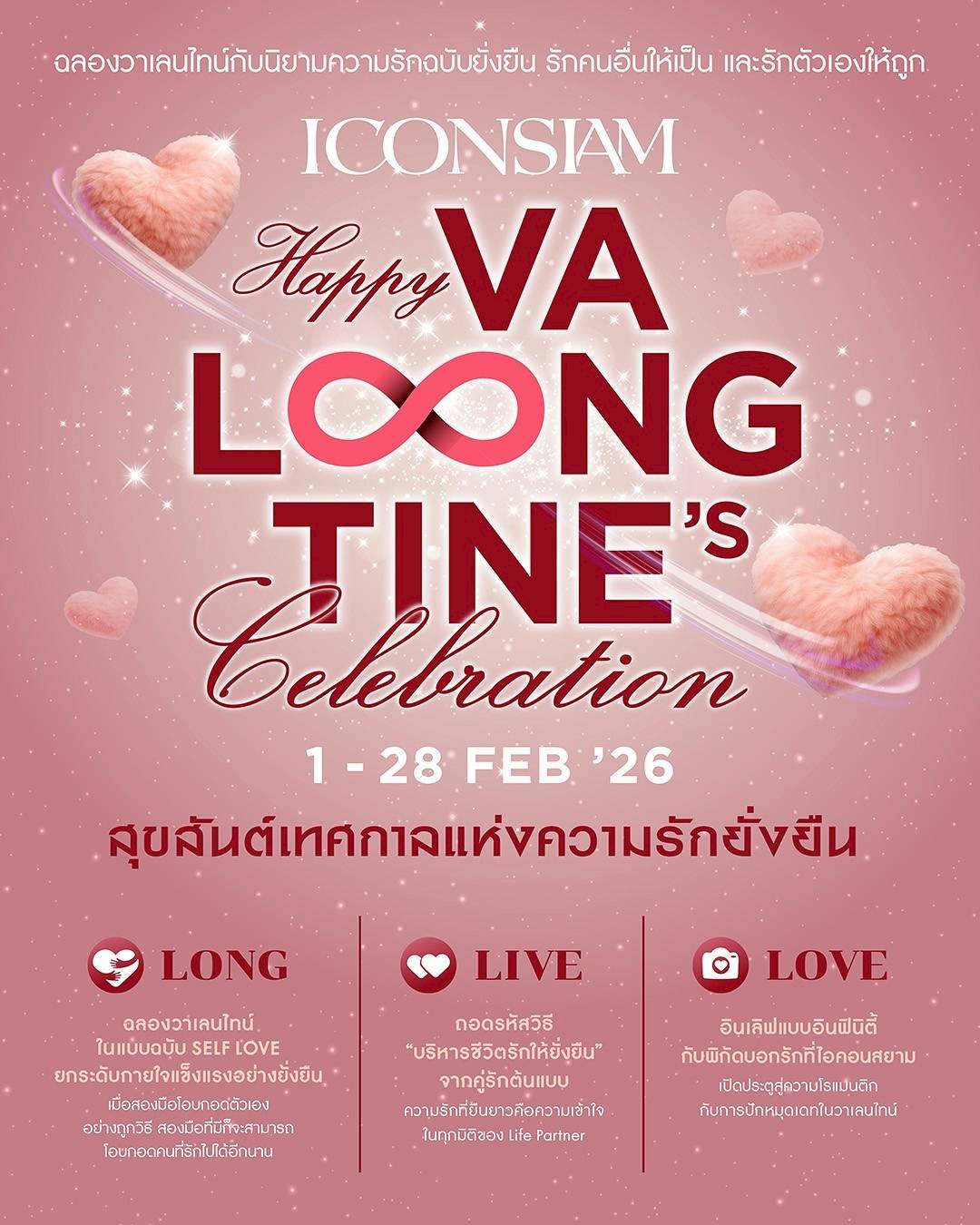 เทศกาลวันแห่งความรักปีนี้หวานละมุนยิ่งกว่าครั้งไหน เมื่อ ไอคอนสยาม เชิญชวนทุกคู่รักมาร่วมสัมผัสประสบการณ์แห่งความผูกพันที่ลึกซึ้งและยั่งยืนยิ่งกว่าเคย ด้วยการฉลองนิยามวันวาเลนไทน์รูปแบบใหม่ให้เป็นเทศกาลแห่งความรักที่ยืนยาว ภายใต้แนวคิด “Happy VaLongTine’s Celebration สุขสันต์วันแห่งความรักยั่งยืน” โดยได้รับเกียรติจากครอบครัวต้นแบบแห่งความสุข คุณบี้ ธรรศภาคย์ และ คุณกุ๊บกิ๊บ สุมณทิพย์ พร้อมด้วยสองโซ่ทองคล้องใจ น้องเป่าเปา และ น้องเป่าเป้ย์ มาร่วมแบ่งปันเรื่องราวความรักแบบฉบับใหม่ ที่สะท้อนถึงการรักผู้อื่นให้เป็นและรักตนเองอย่างถูกวิธี โดย ไอคอนสยาม ได้รังสรรค์กิจกรรมอันหลากหลายให้ทุกคู่รักมาชาร์จพลังดีๆ ภายใต้คอนเซ็ปต์ ได้แก่ “LONG | LIVE | LOVE” เพื่อเป็นแรงบันดาลใจให้ทุกคน ได้มีความรักแบบยั่งยืน และค้นพบความหมายที่แท้จริงของความรักที่เริ่มต้นจากภายในสู่ภายนอก